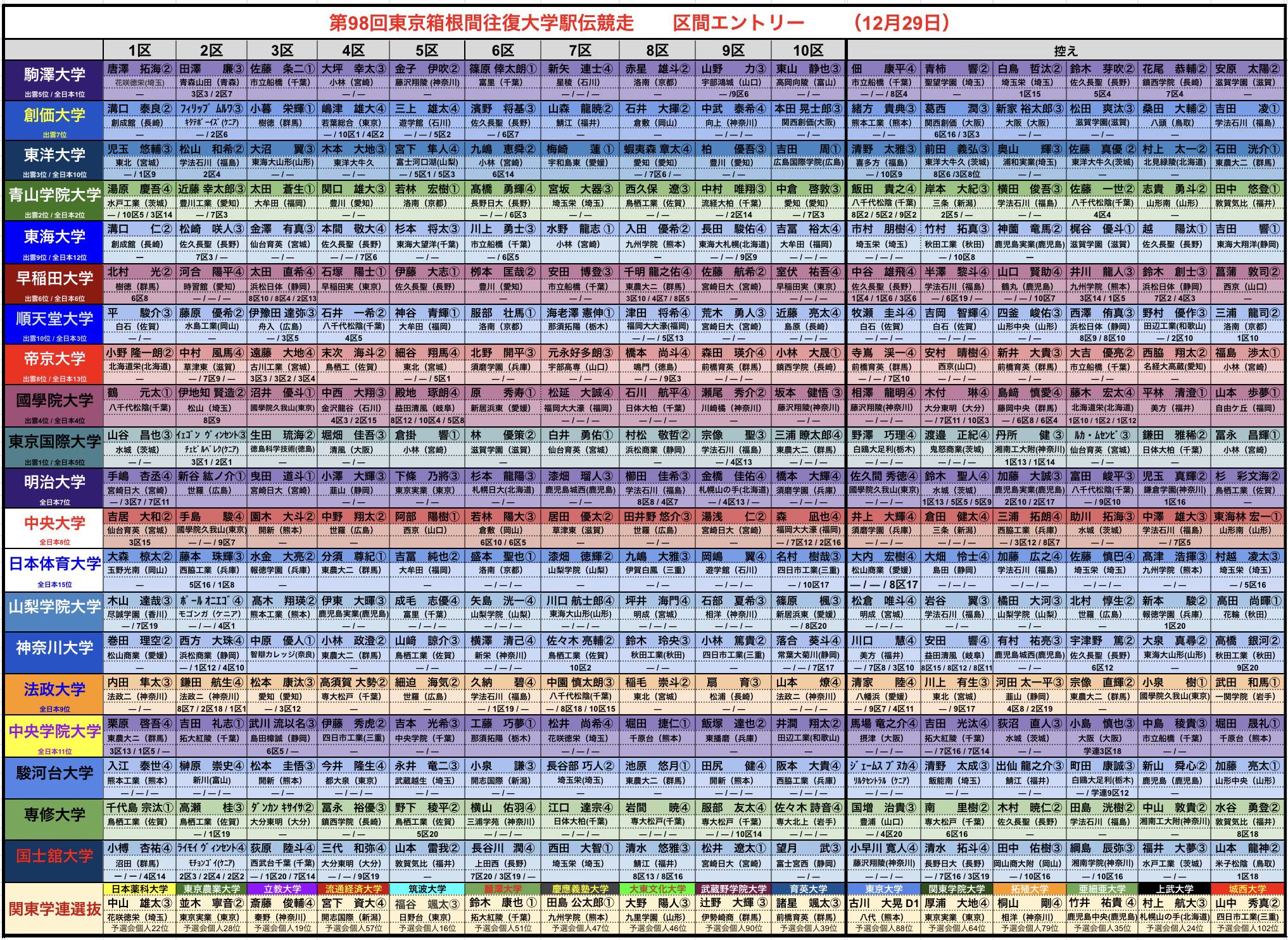 Paul On Twitter 第98回 東京箱根間往復大学駅伝競争 区間エントリー 12 29時点 関東学生陸上競技連盟 Https T Co Bryb2irnyd 当日変更6人可 1日最大4人 箱根駅伝 Hakoneekiden 区間エントリー Https T Co Ureffi2api Twitter